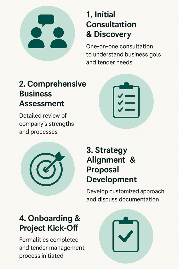 We begin with a consultation to understand your business goals, capabilities, and specific tender needs. This conversation sets the foundation for our partnership and identifies the best opportunities to pursue.